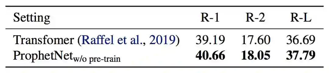 为了进一步探索 ProphetNet 的性能,我们在不预训练的情况下比较了 ProphetNet 和 Transformer 在 CNN/DailyMail 上的性能。实验结果如表5所示,ProphetNet 在该任务上超越了同等参数量的 Transformer。
