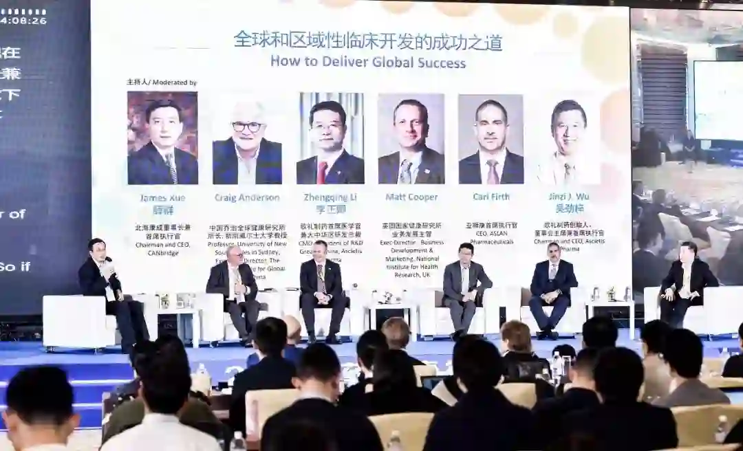 专题讨论嘉宾(从左到右):北海康成董事长兼首席执行官薛群博士、中国乔治全球健康研究所所长Craig Anderson博士、歌礼制药首席医学官兼大中华区研发总裁李正卿博士、英国国家健康研究所业务发展主管Matt Cooper先生、亚狮康首席执行官Carl Firth博士、以及歌礼制药创始人兼首席执行官吴劲梓博士