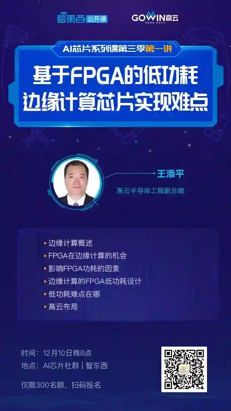 12月10日晚8点,AI芯片系列课第三季第一讲将开讲,由高云半导体工程副总裁王添平主讲,主题为《基于FPGA的低功耗边缘计算芯片实现难点》。