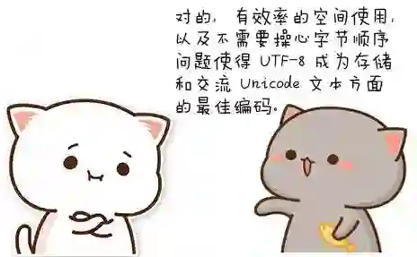 UTF-8 使用一到四个字节来编码一个码点。从 0 到 127 的这些码点直接映射成 1 个字节(对于只包含这个范围字符的文本来说,这一点使得 UTF-8 和 ASCII 完全相同)。接下来的 1,920 个码点映射成 2 个字节,在 BMP 里所有剩下的码点需要 3 个字节。Unicode 的其他平面里的码点则需要 4 个字节。UTF-8 是基于 8 位的码元的,因此它并不需要关心字节顺序(因为字节就是 8 位的呀,其它 UTF-16 和 UTF-32 在不同的机器编译环境下需要考虑字节的顺序问题)。