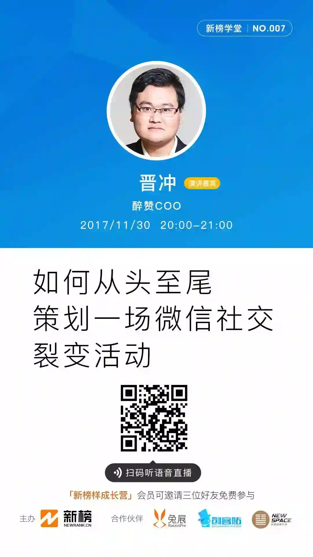 本次新榜课堂邀请到醉赞COO晋冲,分享《如何从头到尾策划一场微信社交裂变活动?》,感兴趣的小伙伴可扫码报名。