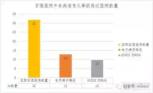 由表可知,通过互联互通标准化成熟度测评的医院为32家,通过电子病历系统应用水平分级评价的医院为13家,通过HIMSSEM RAM评级的医院为10家。可以认为,目前国内顶级医院更倾向于参与互联互通标准化成熟度测评。(注:以下内容中出现的高、低等主观评价,只是相对本百强榜而言)