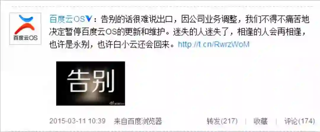 但好景不长,2015年1月,百分之百被传倒闭,旗下百加手机业务已暂停。2个月后,百度云OS发布公告称:“由于公司内部业务调整,百度云OS将于2015年3月11日起,暂停更新。”当时,百度云OS已发布6个正式版,迭代了67个公测版,适配超过150款机型,用户数超过1000万。
