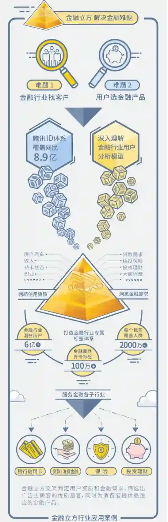 为解决金融行业面临的营销痛点,腾讯社交广告推出了“金融立方”整体解决方案,通过海量用户数据精准了解用户需求,预判用户行为,从社交数据中提炼出用户的信用资质与金融需求,帮助金融各子行业精准发掘最有需求的用户,挖掘数据的最大价值。
