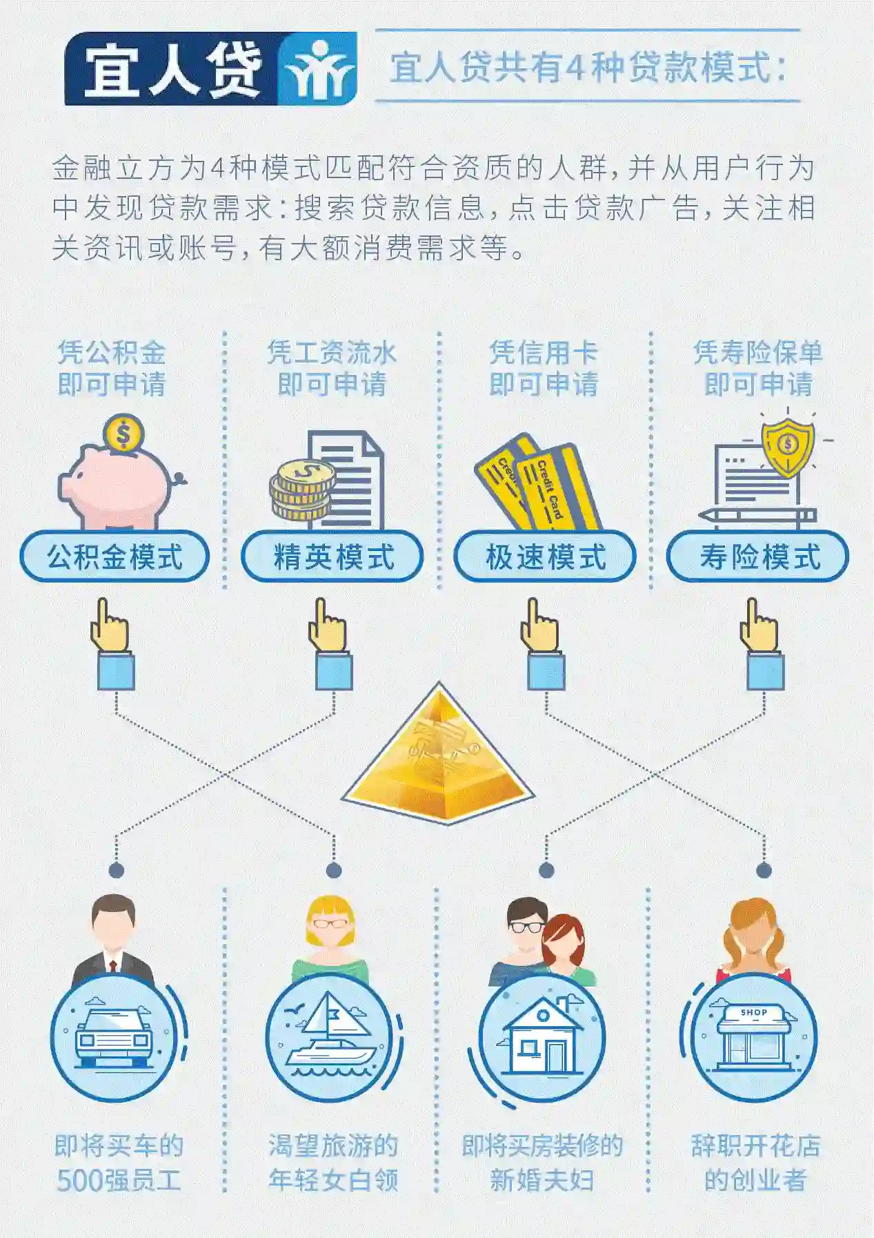宜人贷借助腾讯社交广告海量社交数据判断贷款需求,定位高资质人群,并针对不同需求推荐不同贷款,降低获客成本的同时达到管控风险目的。