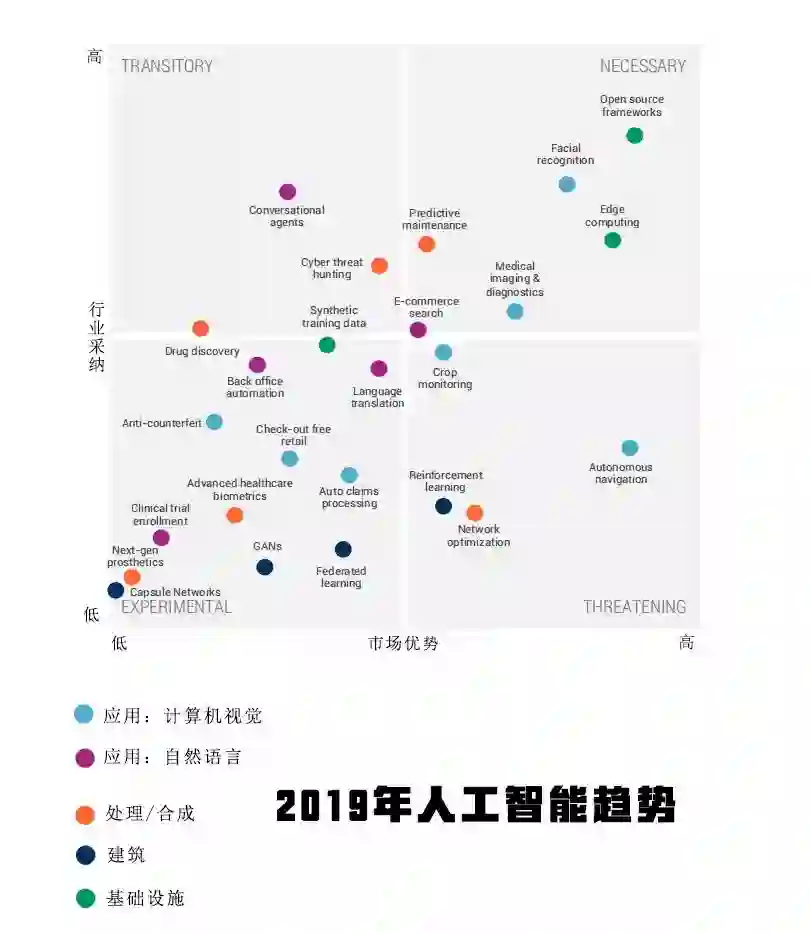 编者按:知名创投研究机构CB Insights调研了25种最大的AI趋势,以确定2019年该技术的下一步趋势,他们根据行业采用率和市场优势评估了每种趋势,并将其归类为必要、实验性、威胁性、暂时的,网易智能整理翻译,参与小小、Meadowdow、毅力、nariiy、Aaliyah。