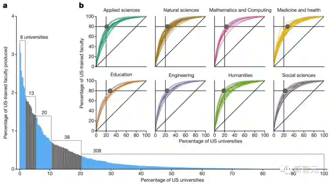 上面右图为具体到各个学科领域层面的教职培养数量的洛伦兹曲线。灰色点为「二八分界点」,代表该领域排名前20%的大学培养出了80%的教职人员。