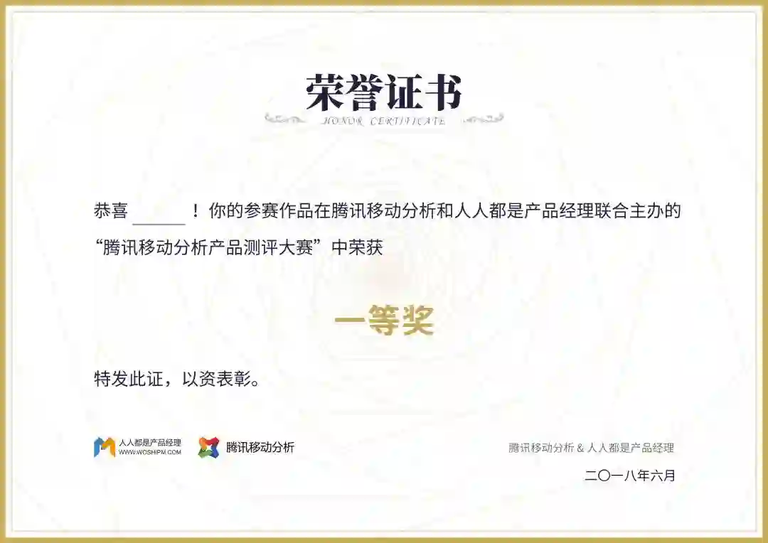 所有获奖者(排名不分先后)均可获得由人人都是产品经理联合腾讯移动分析共同颁发的荣誉证书一份: