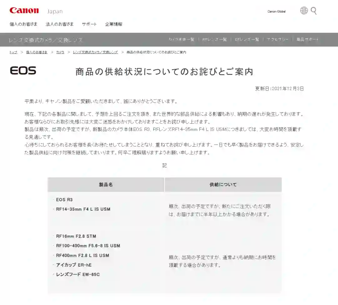 佳能日本官网于昨日发布通知,表示目前受到全球零部件供应的影响,多款产品出现交货延迟的现象。预计佳能 EOS R3 无反相机、RF14-35mm F4 L IS USM 镜头会按照顺序发货,但是新订单可能需要半年以上时间才可以发货,其余新产品将按照预定的先后次序一一发货。佳能对久等的顾客深表歉意,公司将继续采取措施确保产品的稳定供货,以便尽快交付,感谢用户的耐心和理解。