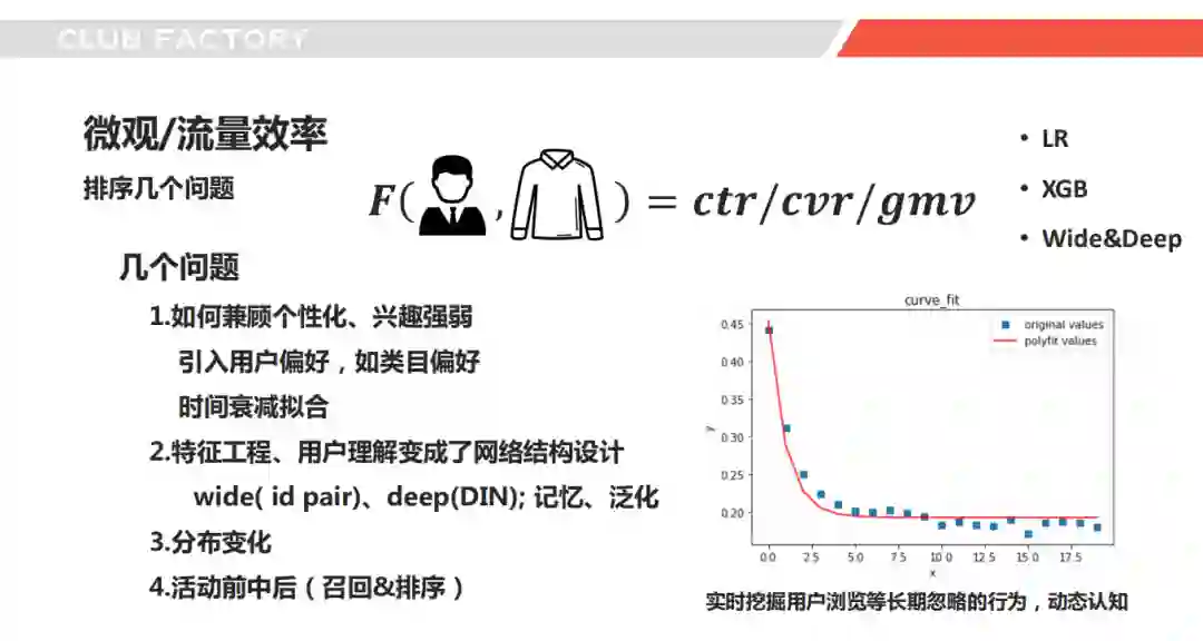 讲完召回我们再讲讲排序,排序我们也是按照业界的常规思路,尝试了lr、xgb、wide&deep等模型,这里面挑了几个问题点来讲,这里的工作集中在数据清洗构建契合实际场景的样本,构建丰富的用户、商品、上下文特征来预估点击率、转化率。