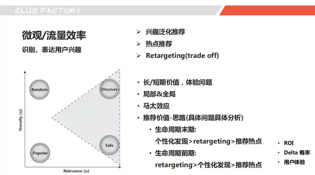 第四点,全局收益,场景打通了看,平衡局部最优和全局最优,举个例子就是往往很多产品在推荐的初期,个性化场景非常相似,因为都是根据用户的行为,利用现有最优的模型进行排序,往往结果相近或者类似,但是忘记了用户购物需求很多时候是有上限的,不会因为你推荐的好我就会买很多,有些场景应该重短期转化有些场景应该重回访、复购等长期指标,最终构建接近全局最优的推荐方法论。