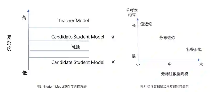 根据无标注数据的规模,蒸馏使用的约束可以不同。如图7所示,如果无标注数据规模小,可以采用值(logits)近似进行学习,施加强约束;如果无标注数据规模中等,可以采用分布近似;如果无标注数据规模很大,可以采用标签近似进行学习,即只使用Teacher Model的预测标签来指导模型学习。