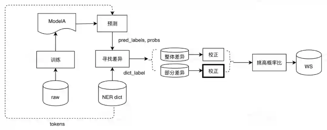 (2)词典数据预测:实体识别模块目前沉淀下百万量级的高质量实体数据作为词典,数据格式为实体文本、实体类型、属性信息。用上一步得到的ModelA预测改词典数据输出实体识别结果。