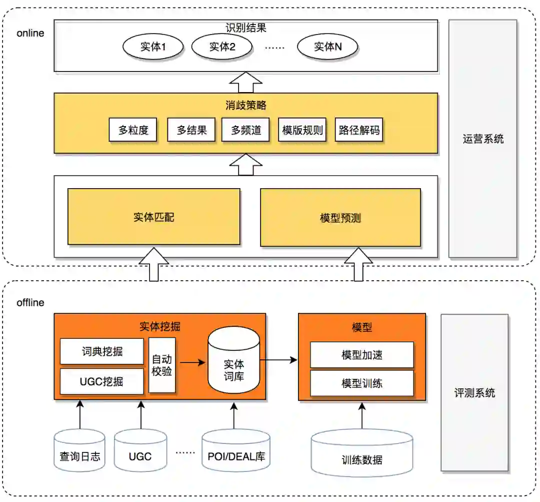 传统的NER技术仅能处理通用领域既定、既有的实体,但无法应对垂直领域所特有的实体类型。在美团搜索场景下,通过对POI结构化信息、商户评论数据、搜索日志等独有数据进行离线挖掘,可以很好地解决领域实体识别问题。经过离线实体库不断的丰富完善累积后,在线使用轻量级的词库匹配实体识别方式简单、高效、可控,且可以很好地覆盖头部和腰部流量。目前,基于实体库的在线NER识别率可以达到92%。