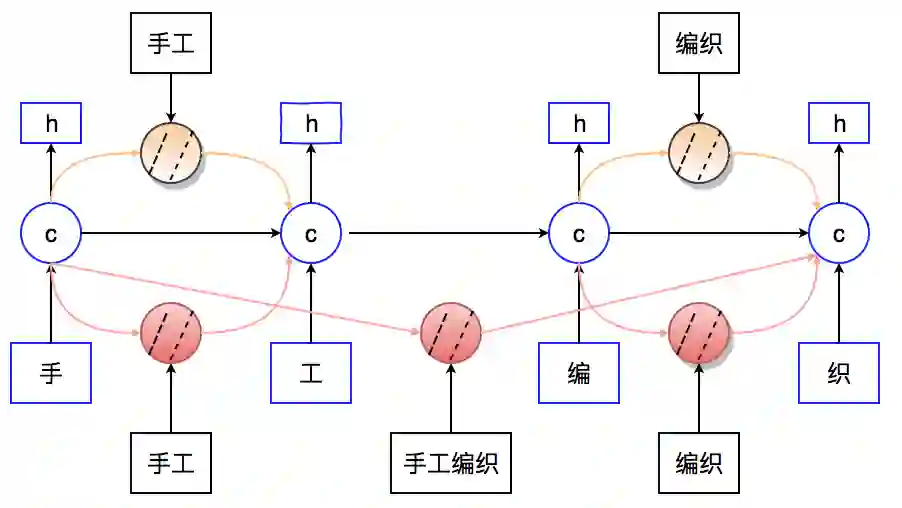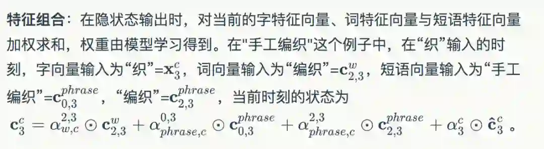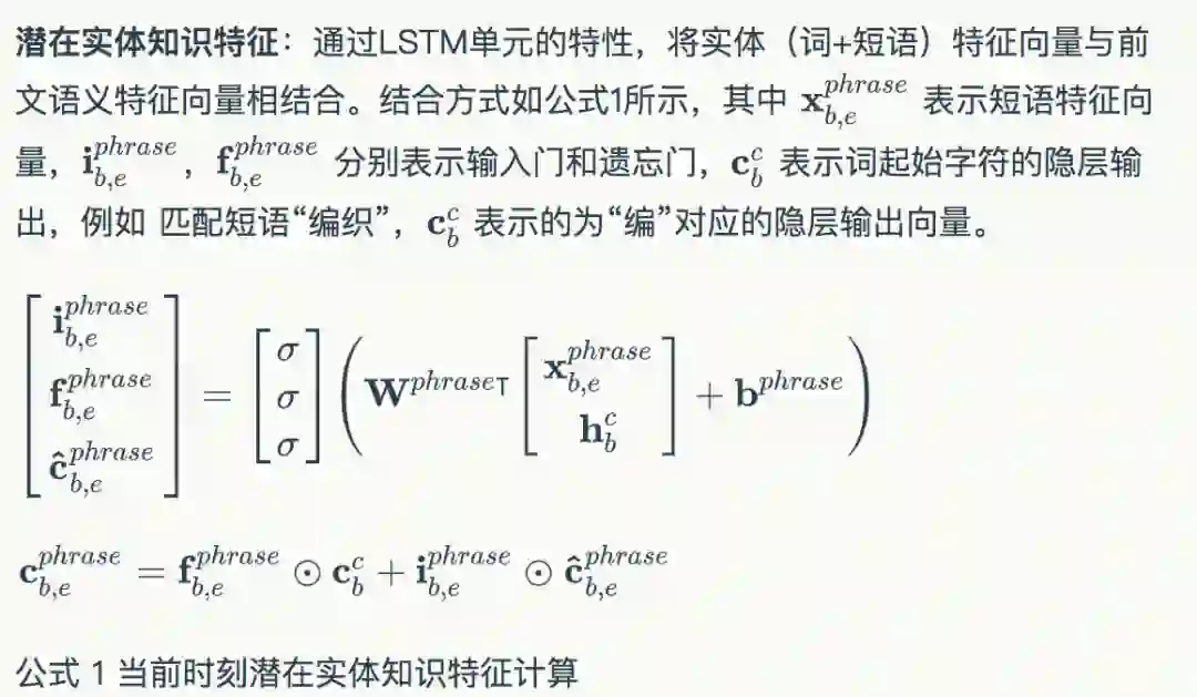 模型结构如图11所示,蓝色部分表示一层标准的LSTM网络(可以单独训练,也可以与其他模型组合),输入为字向量,橙色部分表示当前查询中所有词向量,红色部分表示当前查询中的通过Step1计算得到的所有短语向量。对于LSTM的隐状态输入,主要由两个层面的特征组成:当前文本语义特征,包括当前字向量输入和前一时刻字向量隐层输出;潜在的实体知识特征,包括当前字的短语特征和词特征。下面介绍当前时刻潜在知识特征的计算以及特征组合的方法。(下列公式中,σ表示sigmoid函数,⊙表示矩阵乘法)