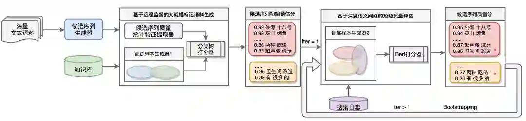 Step3: 基于深度语义网络的短语质量评估。在有大量标记数据的情况下,深度网络模型可以自动有效地学习语料特征,并产出具有泛化能力的高效模型。BERT通过海量自然语言文本和深度模型学习文本语义表征,并经过简单微调在多个自然语言理解任务上刷新了记录,因此我们基于BERT训练短语质量打分器。为了更好地提升训练数据的质量,我们利用搜索日志数据对Step2中生成的大规模正负例池数据进行远程指导,将有大量搜索记录的词条作为有意义的关键词。我们将正例池与搜索日志重合的部分作为模型正样本,而将负例池减去搜索日志集合的部分作为模型负样本,进而提升训练数据的可靠性和多样性。此外,我们采用Bootstrapping方式,在初次得到短语质量分后,重新根据已有短语质量分以及远程语料搜索日志更新训练样本,迭代训练提升短语质量打分器效果,有效减少了伪正例和伪负例。