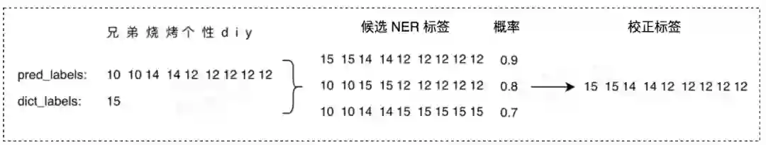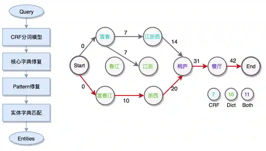 答:目前我们采用训练好的CRF权重网络作为打分器,来对实体词典匹配、模型预测两路输出的NER路径进行打分。在词典匹配无结果或是其路径打分值明显低于模型预测时,采用模型识别的结果,其他情况仍然采用词典匹配结果。