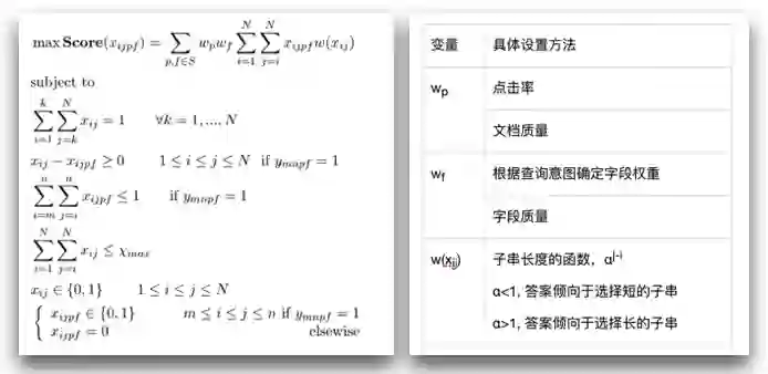 优化目标及约束函数如图10所示,其中p:文档,f:字段,w:文档p的权重,wf:字段f的权重。xijpf:查询子串Qij是否出现在文档p的f字段,且最终切分方案会考虑该观测证据,Score(xijpf):最终切分方案考虑的观测得分,w(xij):切分Qij对应的权重,yijpf : 观测到的匹配,查询子串Qij出现在文档p的f字段中。χmax:查询包含的最大短语数。这里,χmax、wp、wf 、w(xij)是超参数,在求解ILP问题前需要完成设置,这些变量可以根据不同假设进行设置:可以根据经验人工设置,另外也可以基于其他信号来设置,设置可参考图10给出的方法。最终短语的特征向量表征为在POI各属性字段的点击分布。