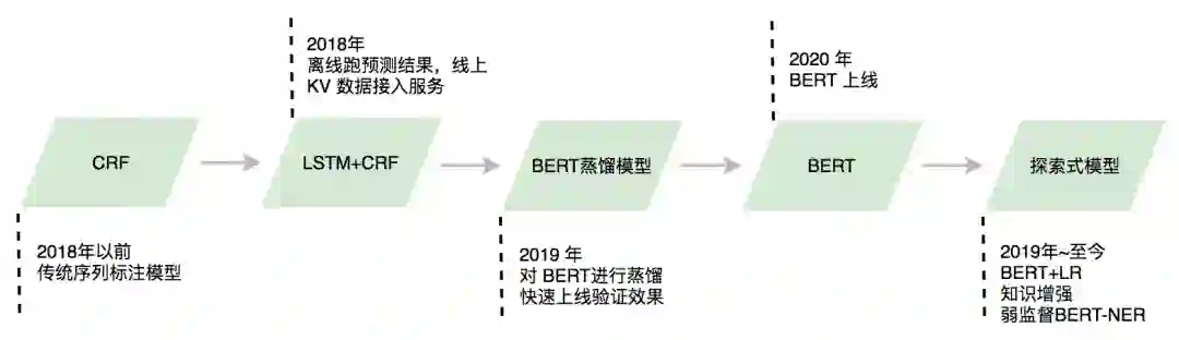 对于长尾、未登录查询,我们使用模型进行在线识别。NER模型的演进经历了如下图5所示的几个阶段,目前线上使用的主模型是BERT[3]以及BERT+LR级联模型,另外还有一些在探索中模型的离线效果也证实有效,后续我们会综合考虑性能和收益逐步进行上线。搜索中NER线上模型的构建主要面临三个问题: