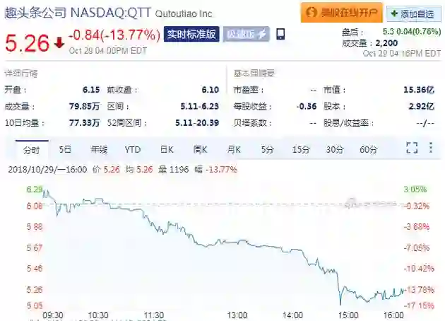@新浪科技【趣头条周一大跌逾13%,创上市以来股价新低】10月30日凌晨消息,趣头条(NASDAQ:QTT)开盘后持续走低,截至收盘,趣头条报5.26美元,跌幅达13.77%,市值15.36亿美元。9月14日,趣头条正式在纳斯达克挂牌上市。上市首日股价一度飙升190%至20.3美元,最终收涨128%。之后,其股价一直处于“过山车式”的涨跌中。