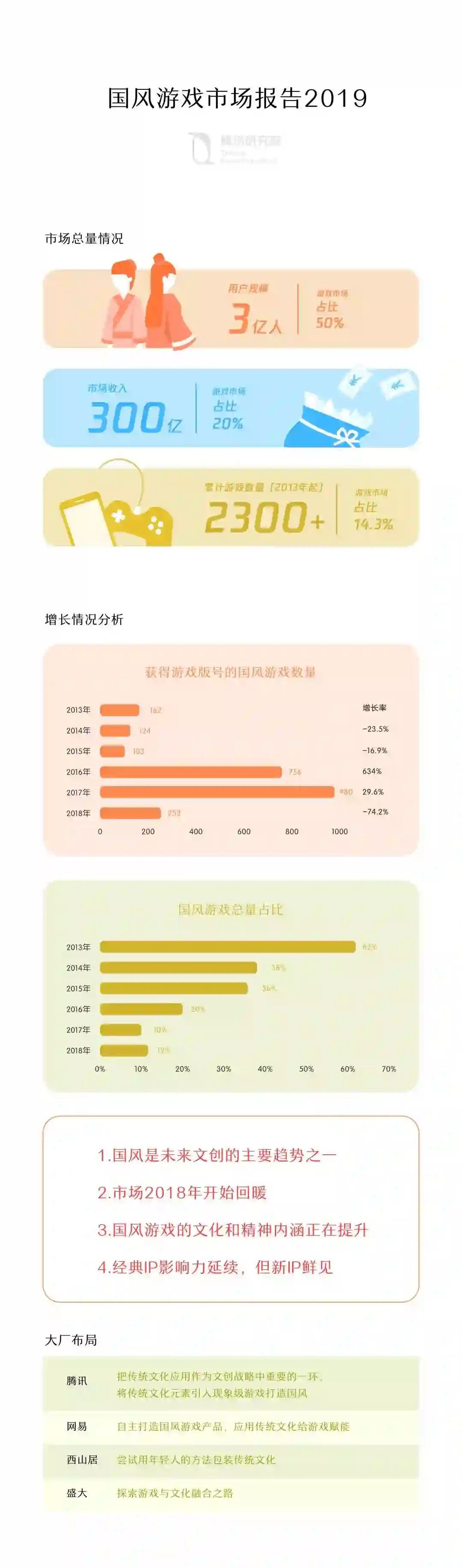 腾讯研究院发布了《国风重光·国风游戏发展研究报告——中国传统文化在游戏领域的转化与创新》报告,通过对国风游戏定义、起源、发展历史和周期的梳理;对市场现状的数据调查与分析,描画出国风游戏市场的全貌,并给出分析和发展建议。