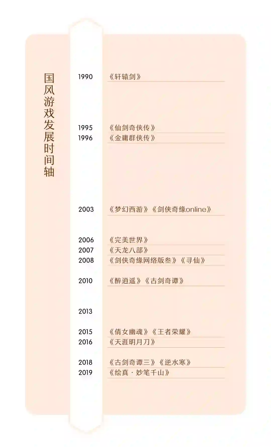 1990年我国第一部国风RPG游戏《轩辕剑》上市,1995年《仙剑奇侠传》发布,掀起了国风游戏的高潮。可以说国风游戏从无到有的这一过程,也正是我国游戏行业从无到有的过程。