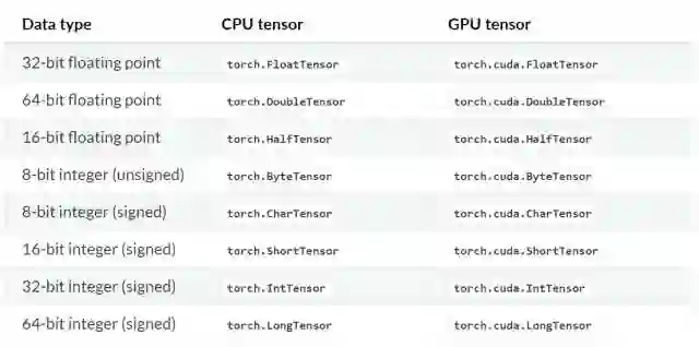 在 PyTorch 中,torch.Tensor 是一种多维矩阵,其中每个元素都是一个单一的数据类型,且该构造函数默认的为 torch.FloatTensor。以下是具体张量的类型: