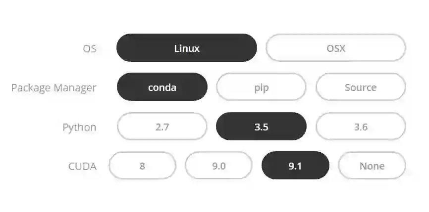 安装 PyTorch 非常简单,我们可以按照自己的系统跟随官方文档的步骤轻松完成。例如以下选择在 Linux、Python 3.5 和 CUDA 9.1 的环境下安装 PyTorch: