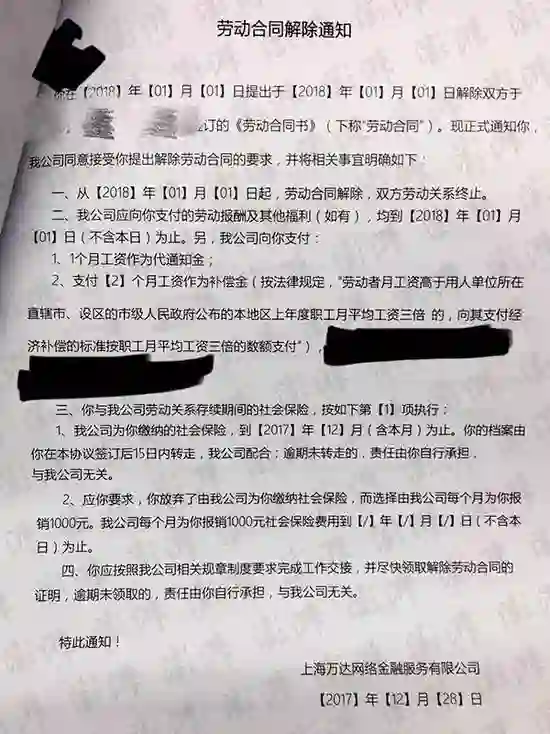 澎湃新闻获得的这份《劳动合同解除通知》内容显示,公司与员工从2018年1月1日起解除劳动合同,此外,万达网科向离职员工支付1个月工资作为代通知金,支付2个月工资作为补偿金,万达网科为员工缴纳的社会保险到2017年12月为止。