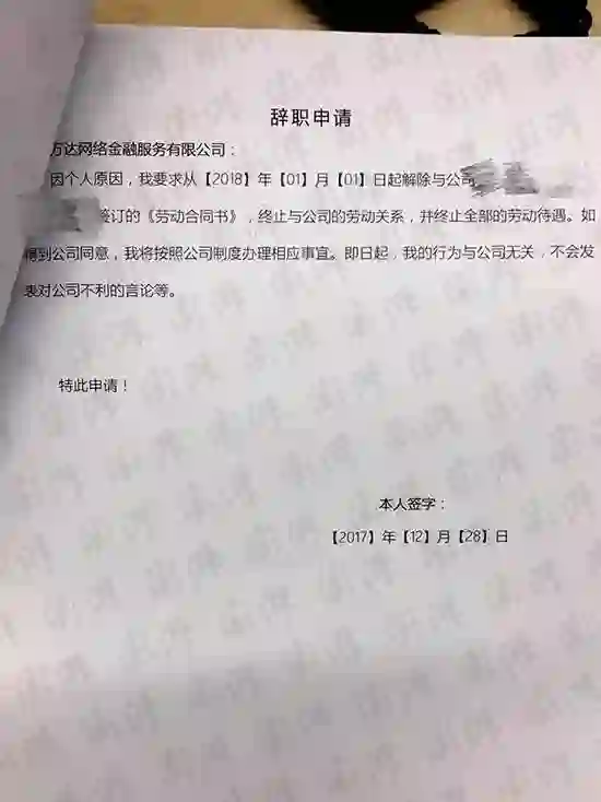 同时,万达网科要求员工提交个人提交的辞职申请。内容显示,“因个人原因,我要求从2018年1月1日起解除与公司于X年X月X日签订的《劳动合同书》,终止与公司的劳动关系,并终止全部的劳动待遇……即日起,我的行为与公司无关,不会发表对公司不利的言论等。”