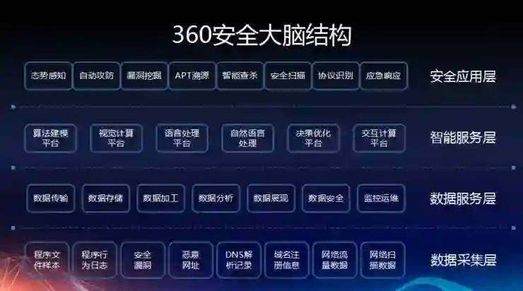为了实现这些能力,安全大脑由数据采集层、数据服务层、智能服务层、安全应用层的一些技术支撑。