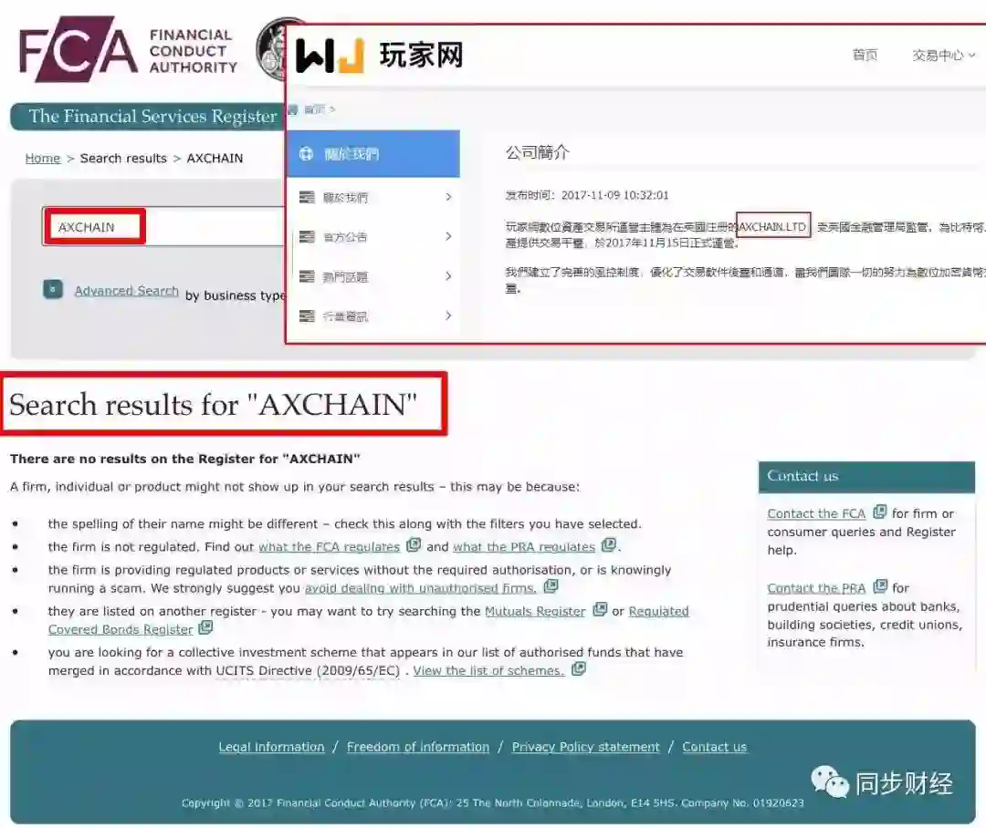 尽管玩家网官方号称“运营主体为在英国注册的AXCHAIN.LTD,受英国金融管理局监管”,但同步财经在英国金融管理局的官方网站上却并没有找到AXCHAIN的相关信息,玩家网的域名和各种联系方式也都巧妙的隐藏了关键信息,显然玩家网的所有者试图把自己藏起来。