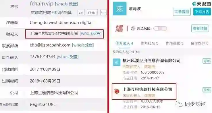 据同步财经调查,Fchain.vip的域名并没有像玩家网官方域名一样做了大量隐私保护处理(阿里云无法为.VIP域名提供隐私保护服务),可以直接查出这一域名所有者为上海互橙信息科技有限公司,注册电话与陈海波一致,在天眼查上查询,上海互橙信息科技有限公司的法人和大股东也是陈海波。