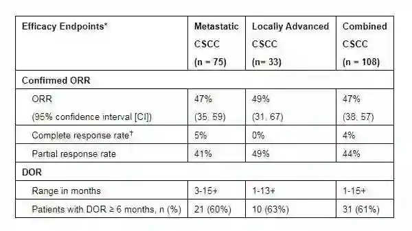 为了测定Libtayo的安全性和有效性,共有108名患者(75名患有转移性疾病,33名患有局部晚期疾病)被纳入疗效评估。结果显示,使用Libtayo治疗的所有患者中有47.2%的患者肿瘤缩小或消失。