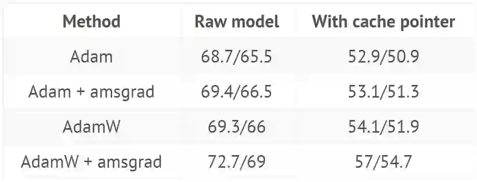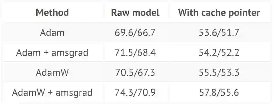使用来自 GitHub(https://github.com/salesforce/awd-lstm-lm)的超参数训练 AWD LSTM(结果显示在有或没有缓存指针(cache pointer)情况下验证/测试集的困惑度):
