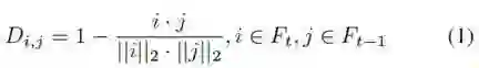 使用Faster R-CNN([3])检测获取图像中的对象,其中300个区域提议和锚步长为8个像素,骨干卷积网络是在ImageNet上预训练的预训练的Inception-Resnet-V2模型[24] 使用KITTI 2D物体检测数据集[4],[5]对数据集进行微调。对于每个检测到的对象,由Fi表示的亲和度特征被提取,并且对于帧 t> 1,成对的特征余弦距离矩阵Di*j被导出如下:
