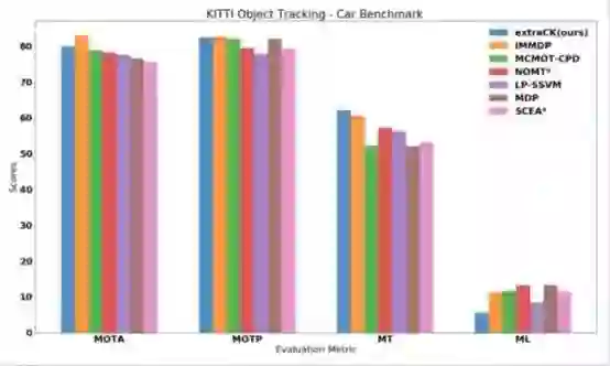 在撰写本论文时,我们的模型在MOTA指标上排名第二,因为与性能更好的方法相比,它具有更高的FN度量值和IDS值,参见表II中的七种方法。定位跟踪对象(即MOTP值)的性能再次排名第二,并且相对接近第一排名方法。根据MT统计度量值以及ML统计度量值,为了捕获大部分跟踪,我们的方法“extraCK”优于其他最先进的方法。我们的方法的基准测试性能被可视化,并与图6中最先进的方法进行比较。