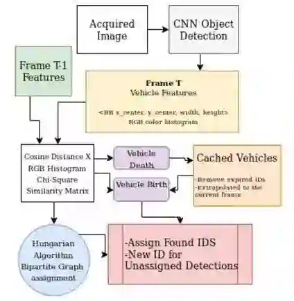 图1 :跟踪器模型的流程图。CNN处理获取的图像以进行对象检测。对于每个检测特征向量和RGB颜色直方图与前一帧进行比较。根据其亲和度测量来分配对象IDS。