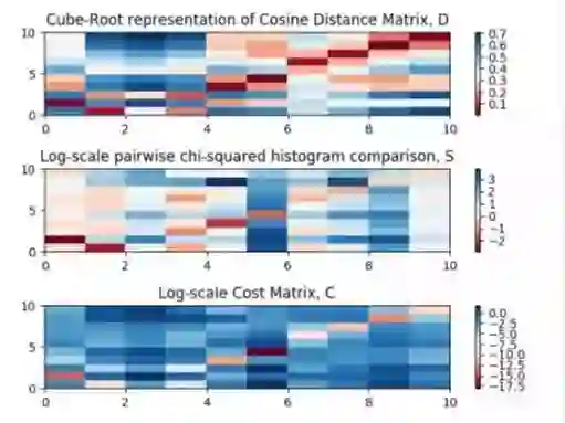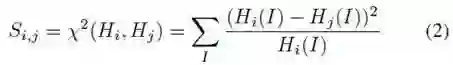 还使用卡方距离比较直方图,其中Si*j表示RGB颜色直方图的卡方距离矩阵。同样,对于t> 1,两个直方图的卡方距离由下式给出: