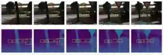 图2:顶行示出了用于KITTI对象跟踪训练序列0001,帧160到164的检测到的车辆和底行立体视差图。由边界框标记的区域的平均差异值以黄色显示。即使低的遮挡率也会导致检测到的对象的平均差异度量在序列中波动,并且不提供稳定的亲和力特征。
