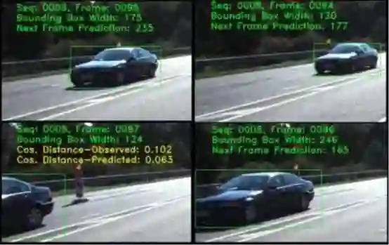 在图5中,被跟踪物体相对于自我车辆从相反方向接近。由于摄像机和检测到的物体之间的相对高速度,边界框特征显示出相当大的变化。如果亲和力模型接受这种相当大的特征距离,则在拥挤的跟踪场景中预测性能会显着降低。但是,将特征向量外推到下一帧可以深入了解下一个可能的边界框以及车辆是否仅部分可见。如果在帧限制之外外推边界框,则排除期望在框架外的部分。放置在图5左下方的框架示出了框架97处的检测的边界框与框架97的预测边界框和框架96中观察到的边界框之间的余弦距离。