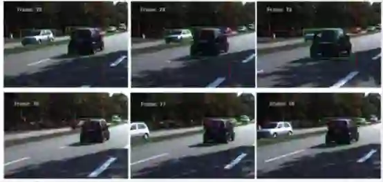 由于CNN的遮挡或假阴性,也无法观察到先前跟踪的车辆。图4示出了说明性示例。CNN在帧73处最后检测到相同的车辆,其被绘制在第一行的最右边,并且直到帧78被重新检测,被绘制在第二行的最左边。在此消失期间,外推缓存的车辆特征以最小化再现时的特征距离。