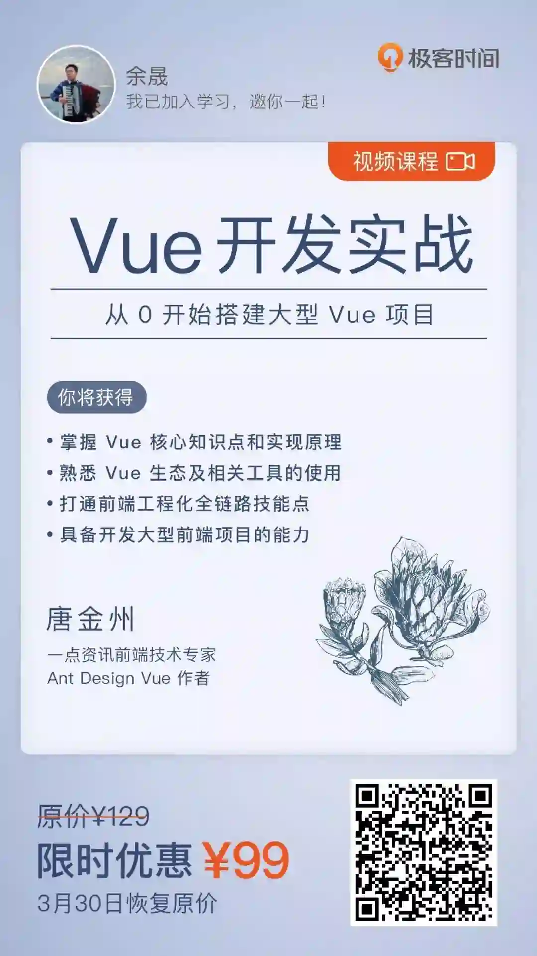 如果你用过VUE,也用过Ant Design,大概知道Ant Design VUE是个广受好评的插件,并被纳入Ant Design的官方域名下,称为官方唯一指定的VUE框架。如今,Ant Design VUE的作者唐金州,在 极客时间 推出了《VUE开发实战》。