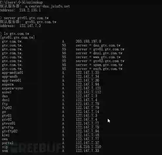 @ 指定域名服务器; axfr 为域传送指令; xxx.edu.cn 表示要查询的域名;