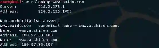 第三步的时候发现shifen.com这个顶级域名的域名服务器和baidu.com这个域的域名服务器是同一台主机。(dns.baidu.com)