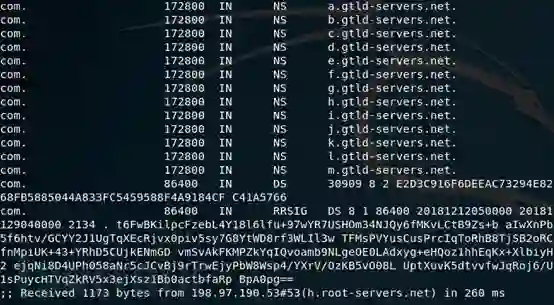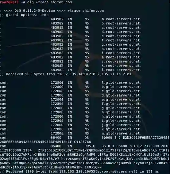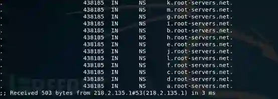 第一步是向我这台机器的ISPDNS(218.2.135.1)获取到根域服务区的13个IP和主机名[a-m].root-servers.net.。