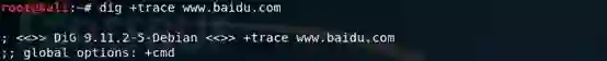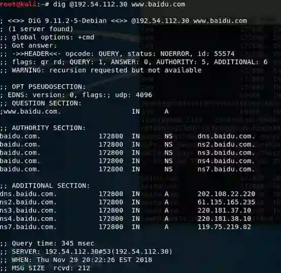 【此处可以用dig @192.54.112.30 www.baidu.com查看返回的百度顶级域名服务器IP地址】。