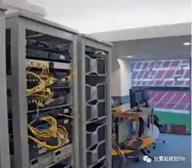 鹰眼系统输入的都是高帧率高清图像,还要合成球运动轨迹,结果要在极短的时间内给出,对计算性能的要求还是很大的。所以看到如下图所示的鹰眼系统控制室里庞大的服务器也没有什么奇怪的了。