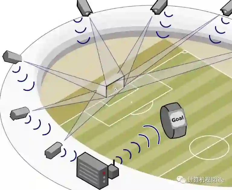 Hawk Eye系统需要在体育场四周不同位置安装14台高速高清摄像机,每7台摄像机关注一个球门。如下图所示。